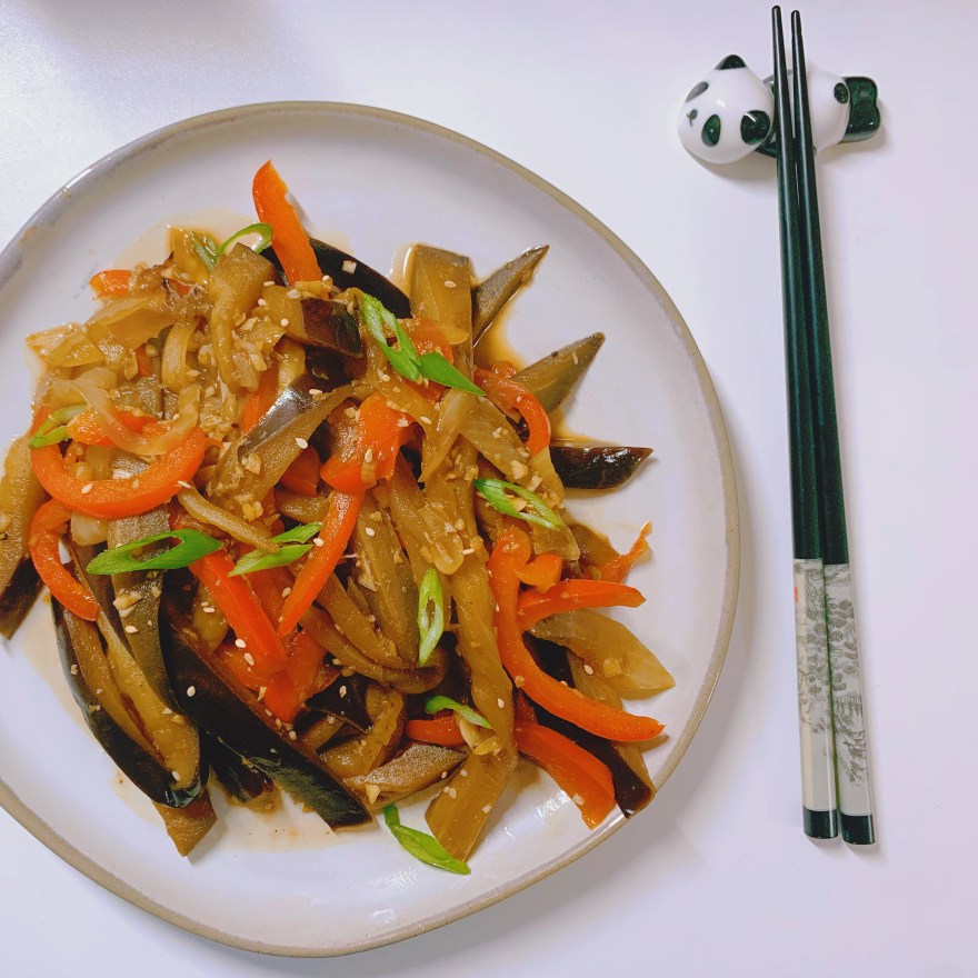 To my surprise, it came out very flavorful. I changed how the eggplant was cut by making it into thin strips. That increased the surface areas, reduced cooking time, and better absorbed and retained the flavor/sauce. After this change,  the sauce was infused into each eggplant “noodle” string. The fact that it looked like a plate of noodles created an illusion tricking the mind into thinking that’s the main (“noodle”) dish. It provided an extra sense of comfort and satiety. There was a less greasy mouthfeel using only one tablespoon of canola oil. The red pepper was crunchy, contrasting the soft eggplant’s texture. It also made the dish a little more refreshing and less heavy.